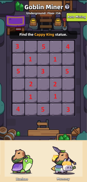 Goblin Miner is one of the Challenges in Capybara Go!. You will have to find the Capy King statue hidden behind mining blocks by mining them.